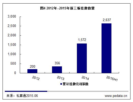 2014年以來,新三板掛牌企業數量爆炸式增長,2013年年末掛牌企業僅為356家,2014年年末掛牌企業已達到1572家,上半年累計新增掛牌數為1,065家,截至2015年6月份累計掛牌數為2,637家,新三板市場的總股本達到1,277.02億股,流通股本476.92億股。2014年8月推出的做市商制度將新三板帶入新的發展階段,新三板交易量大幅上升,2014年全年交易量達到130億。2015年,前6個月的交易量就達到了1039億。